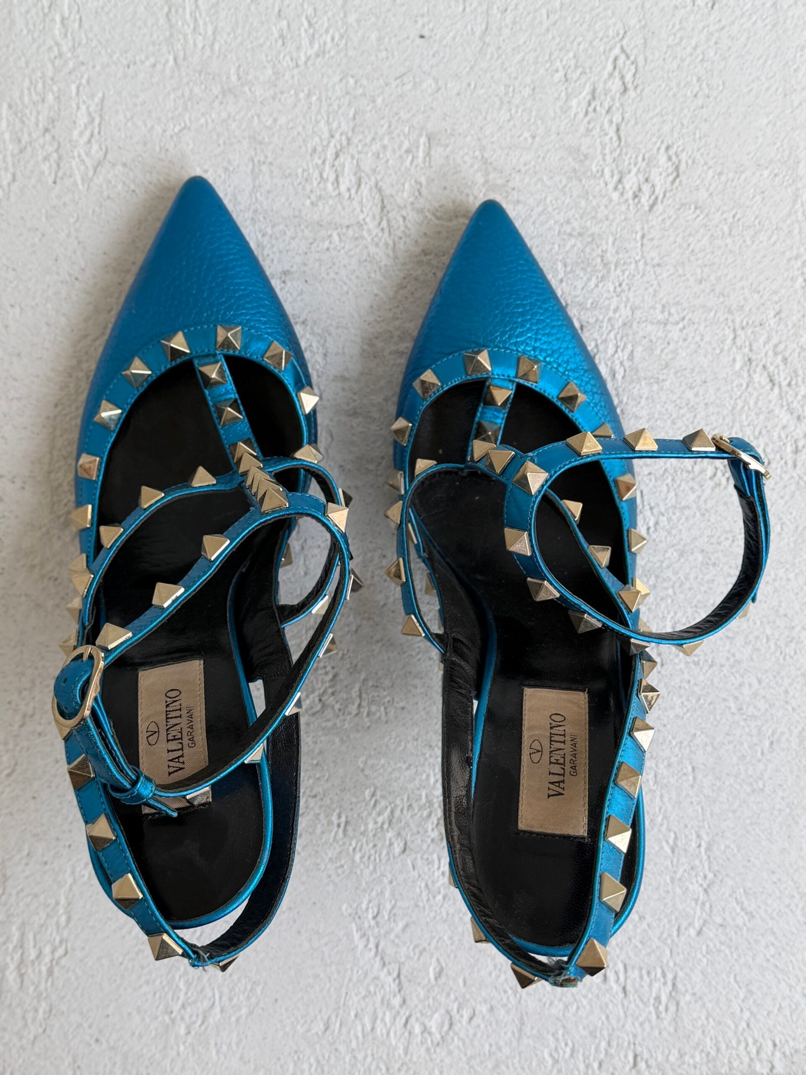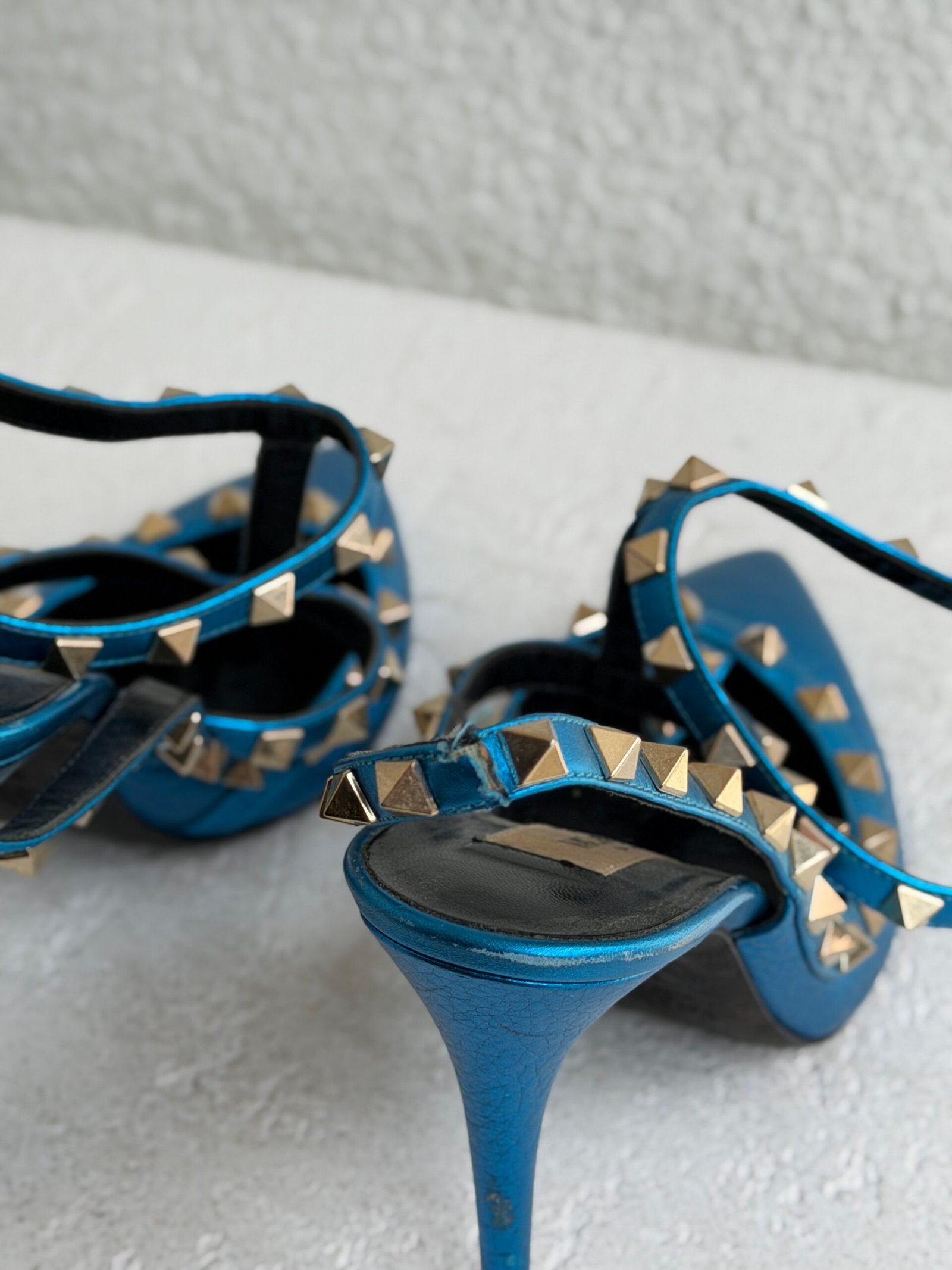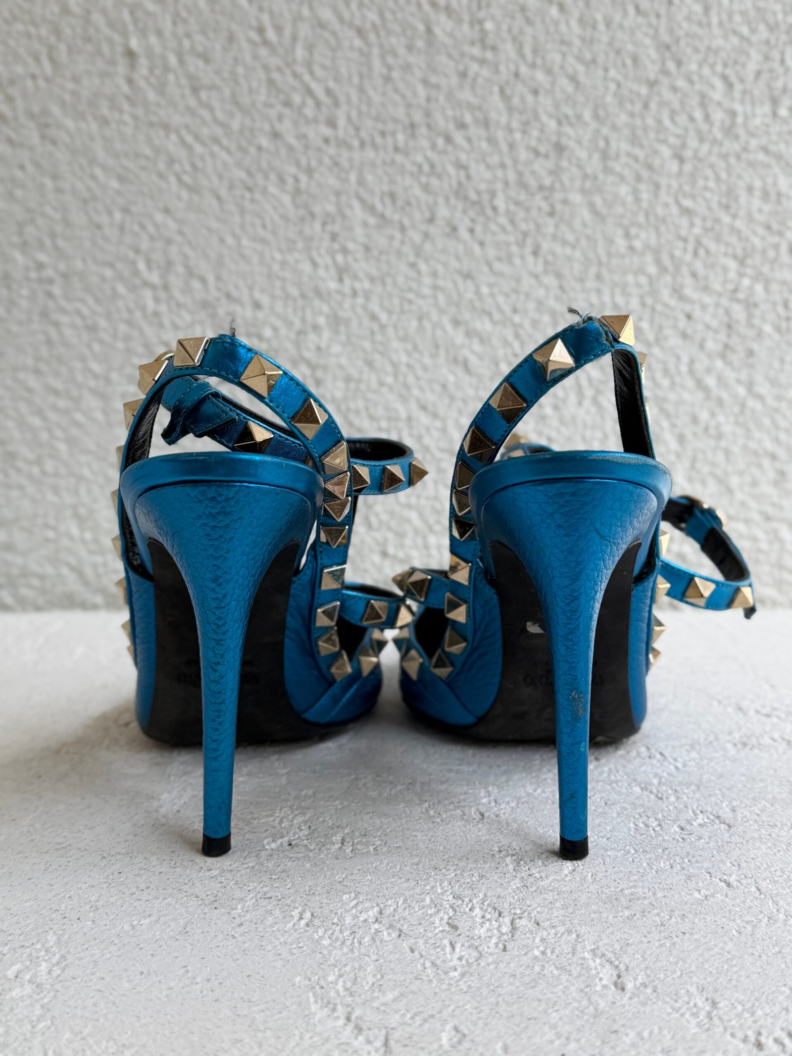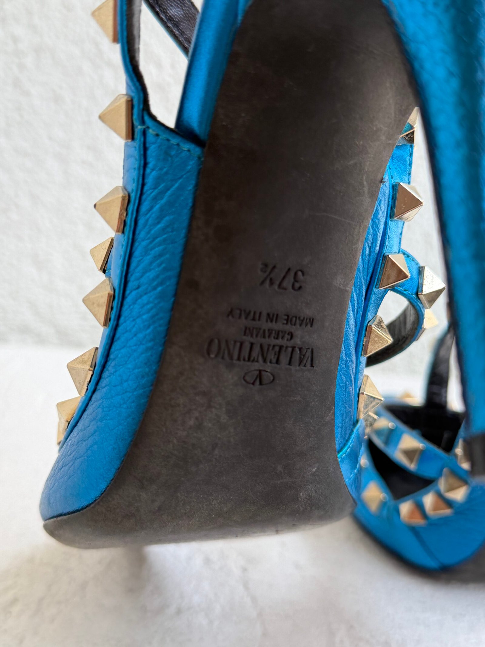 Valentino Metallic Blue Leather Rockstud Heel Sandals, Size 37.5, Blue color