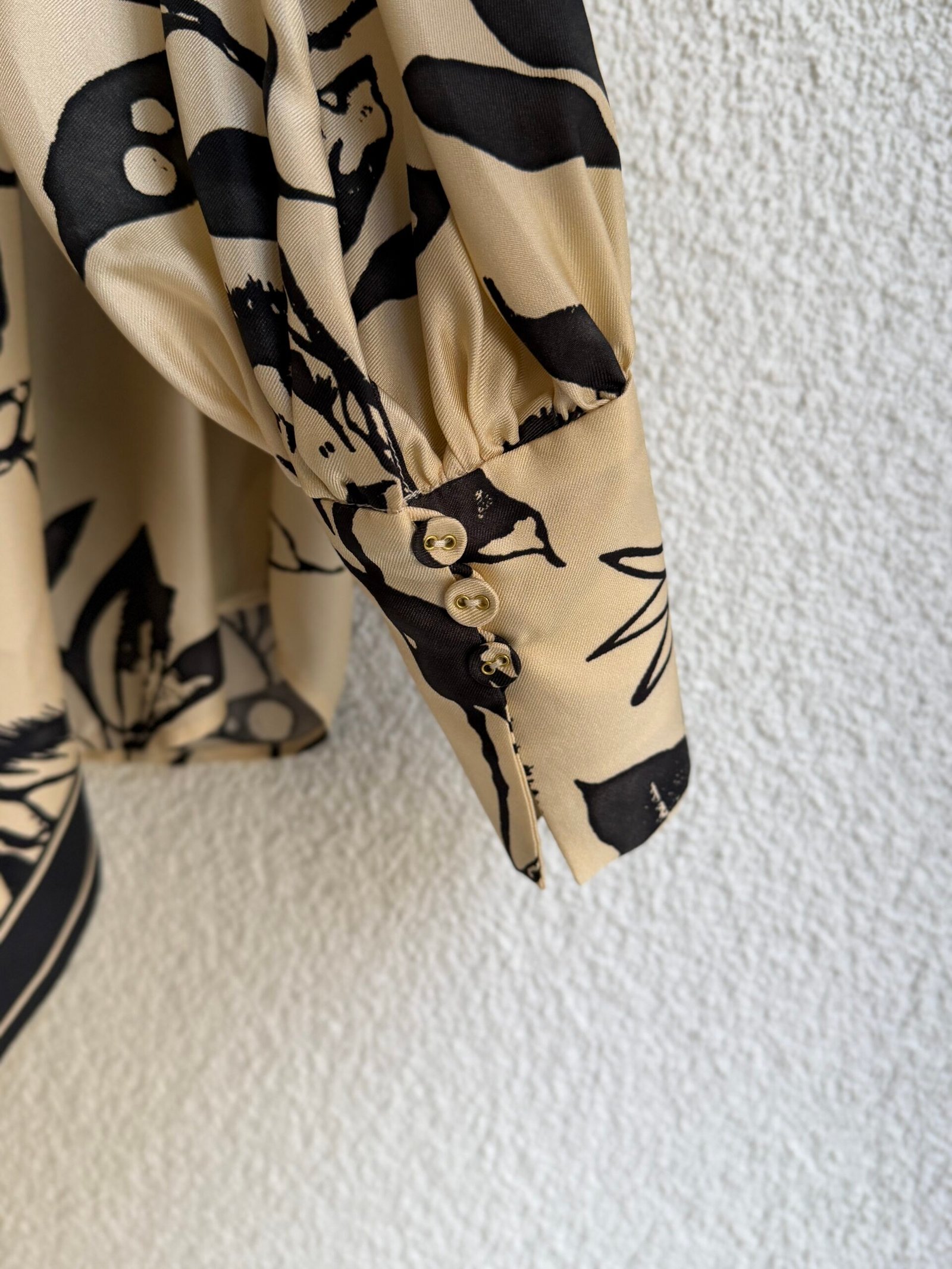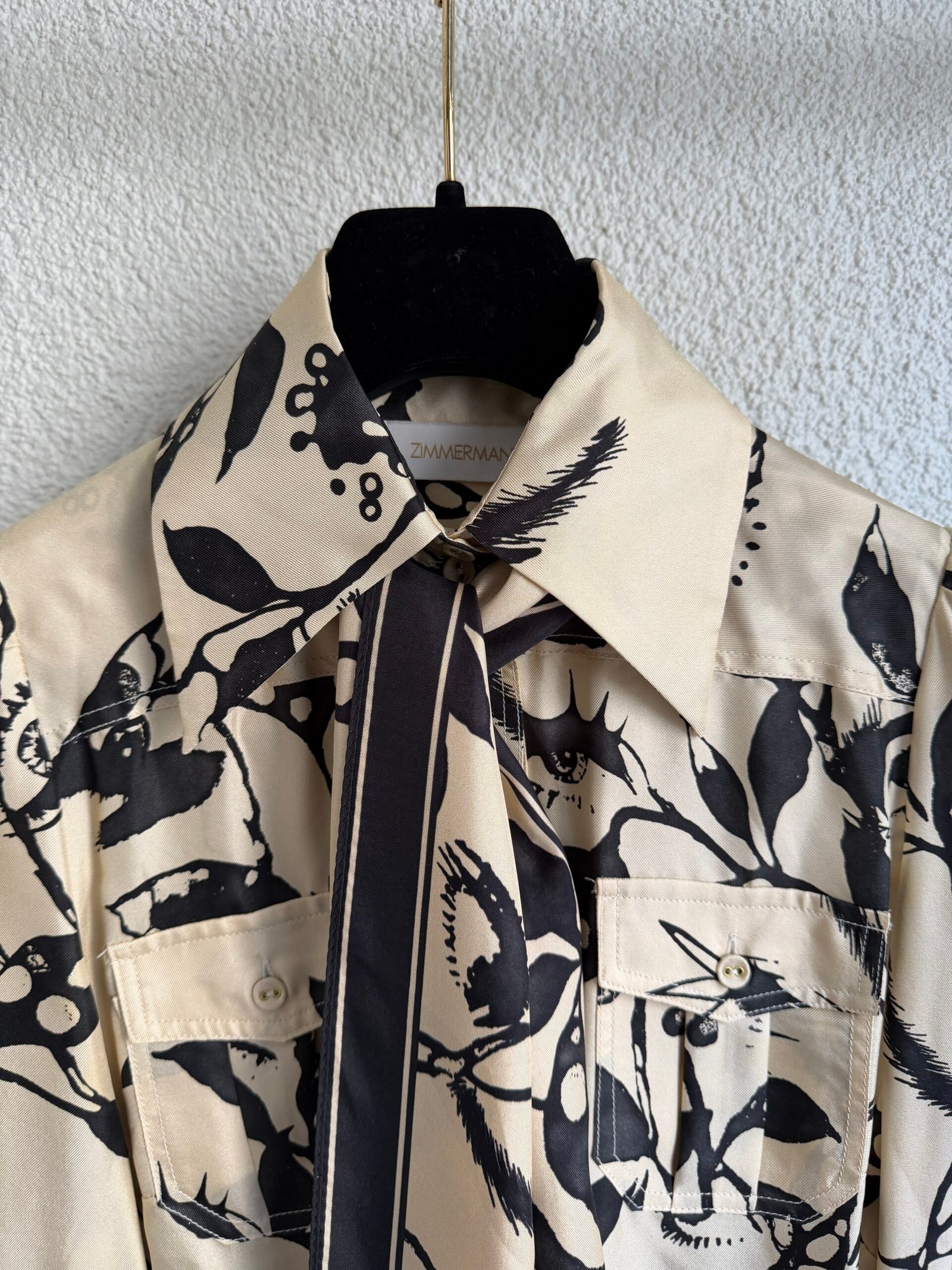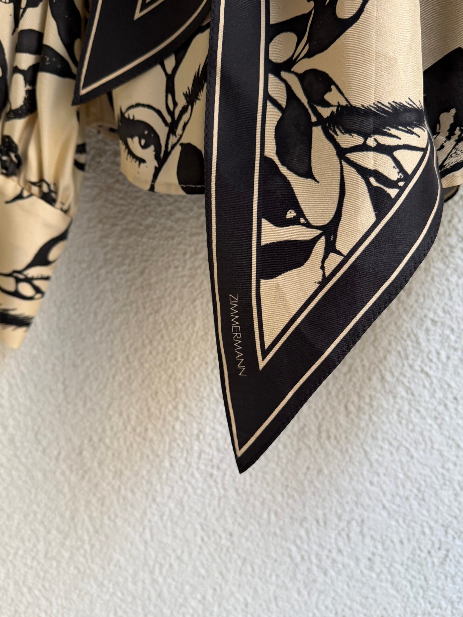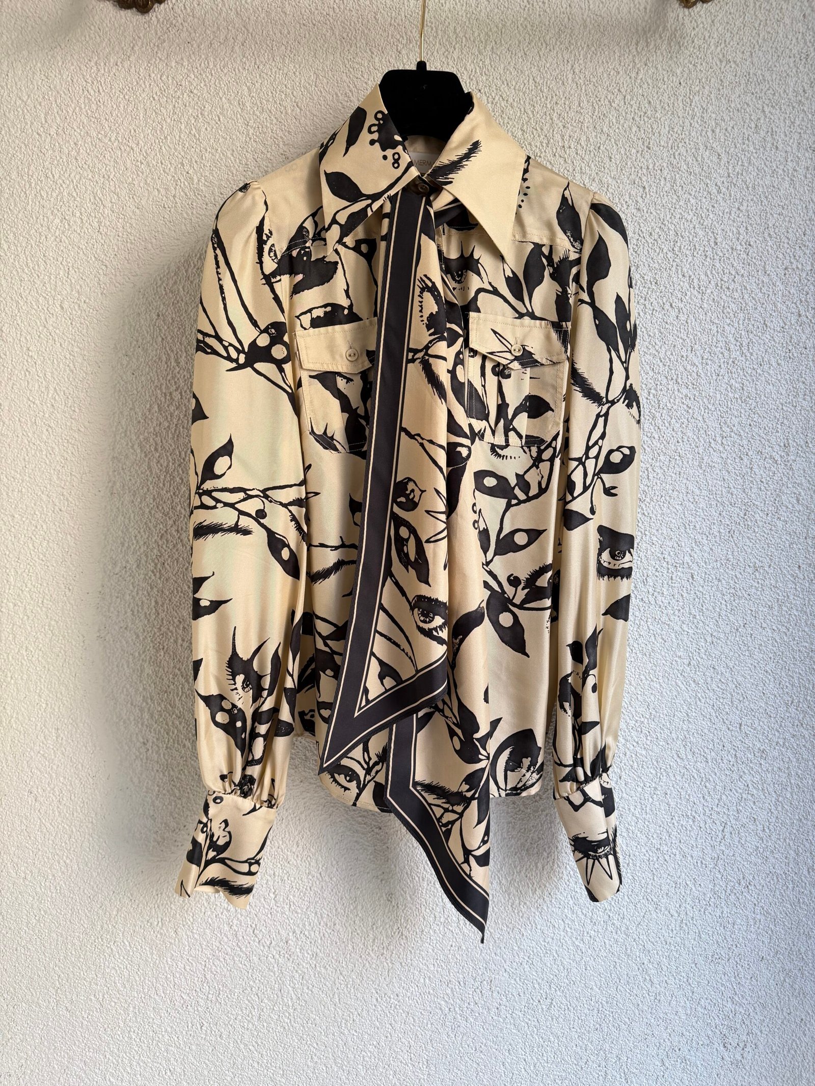 Zimmermann beige eye print silk shirt with extra scarf trim, size 0, chest width 48 cm, length 61 cm, sleeve length 68 cm. 100% Silk.