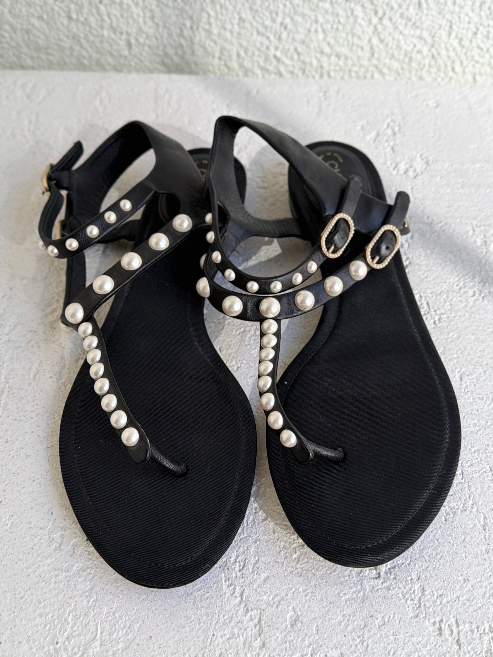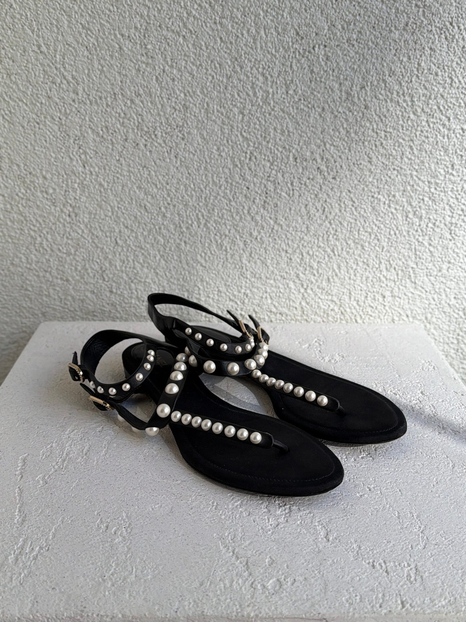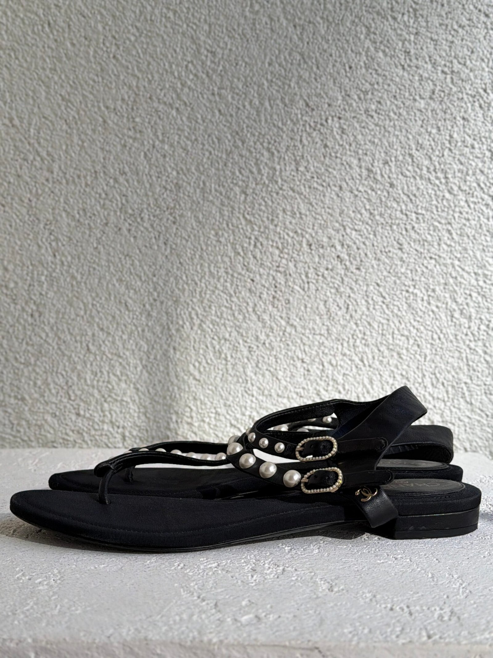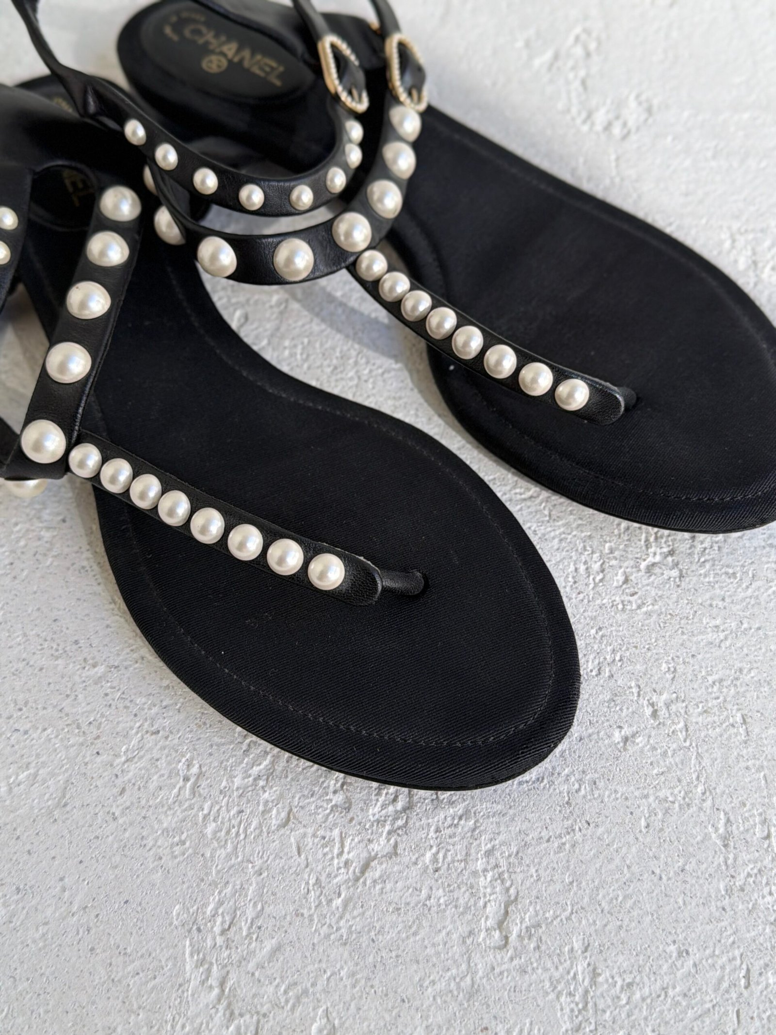 Chanel Black Leather Faux-Pearl Embellished Double Strap Thong Sandals, Size 38.5, Black color