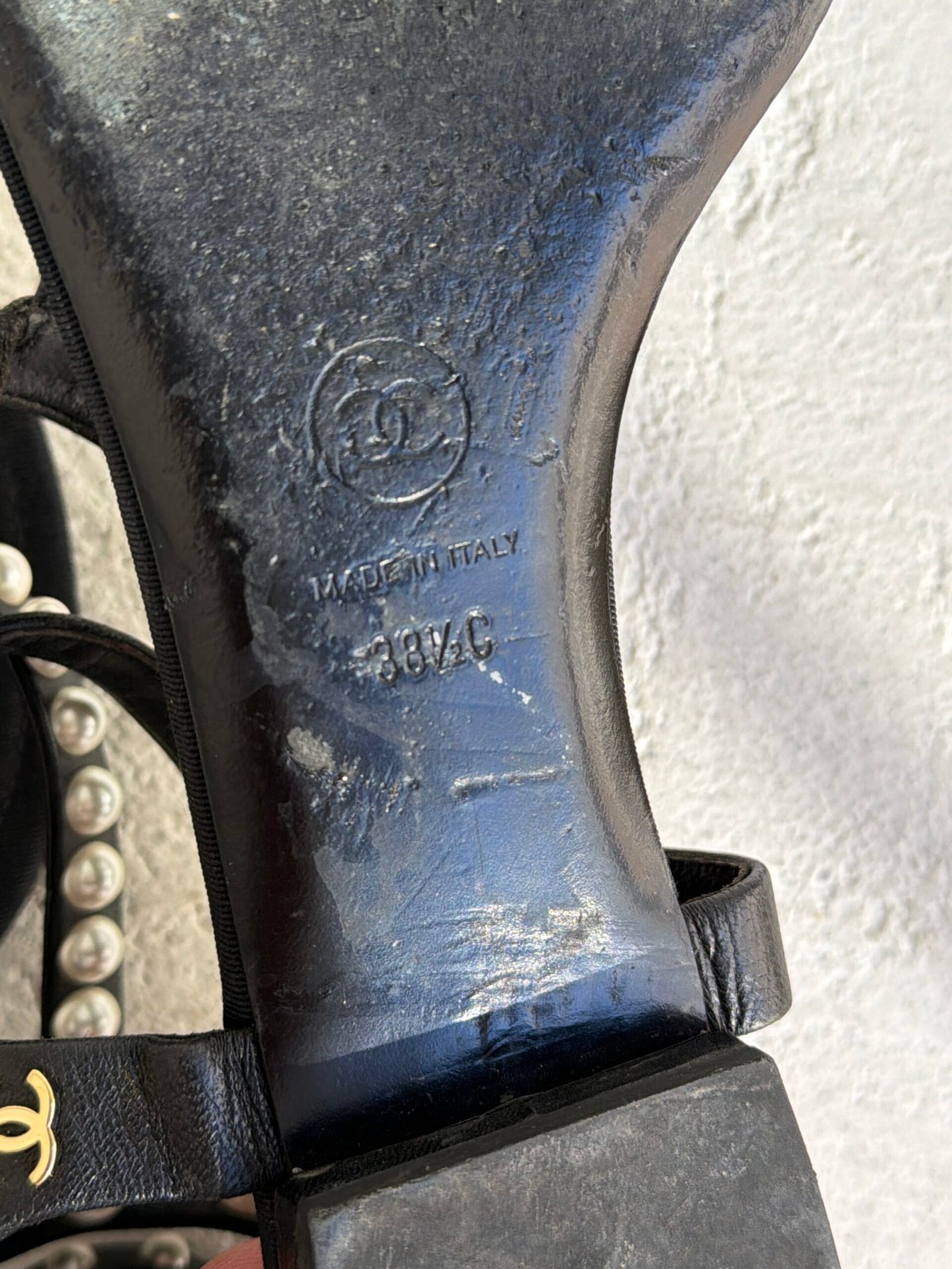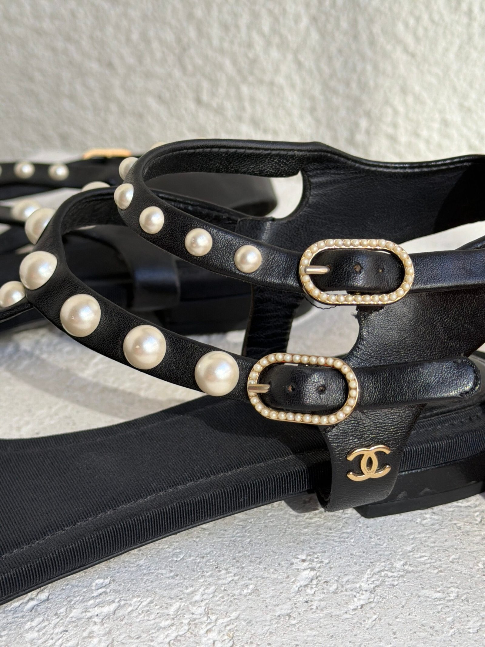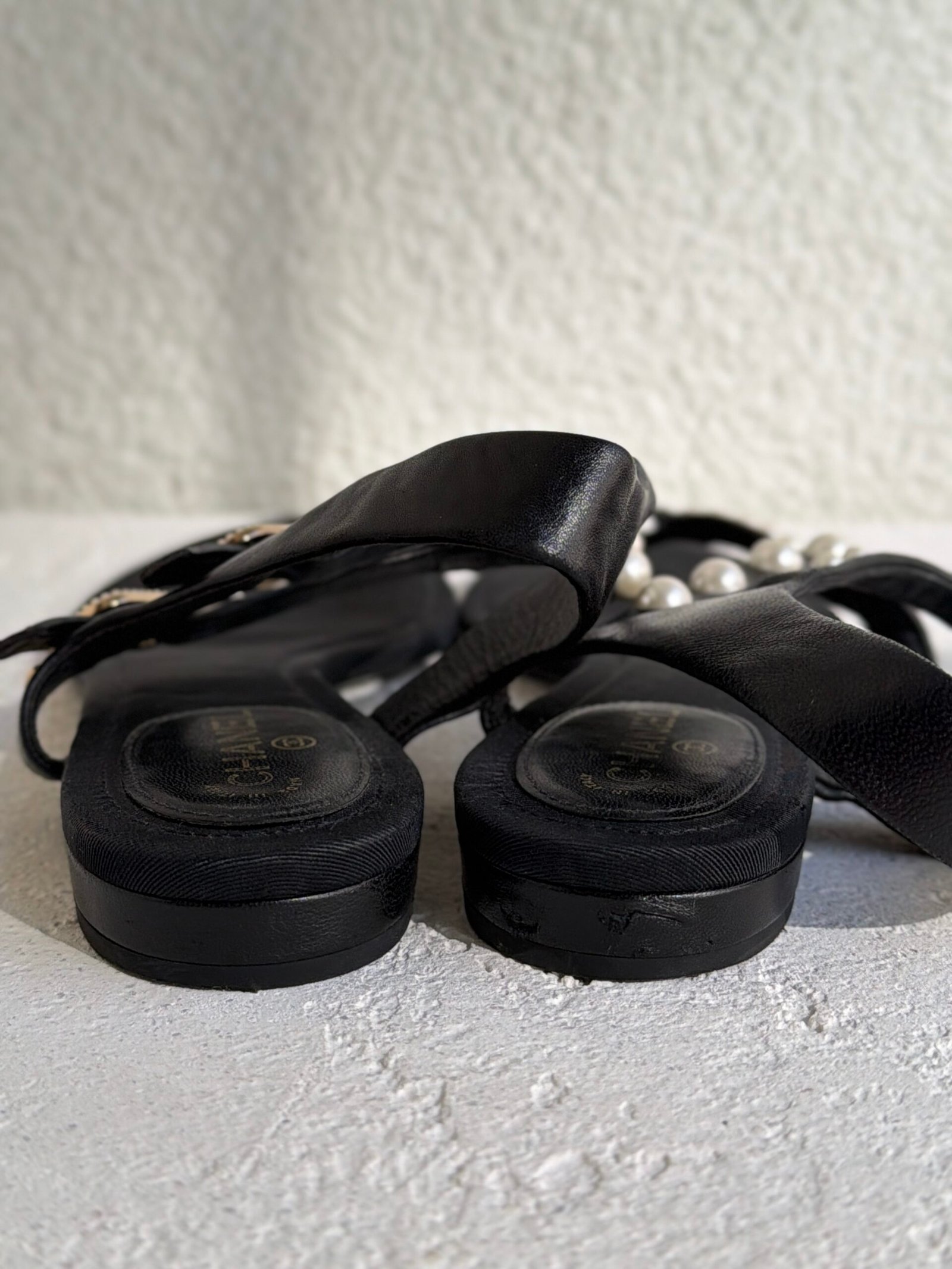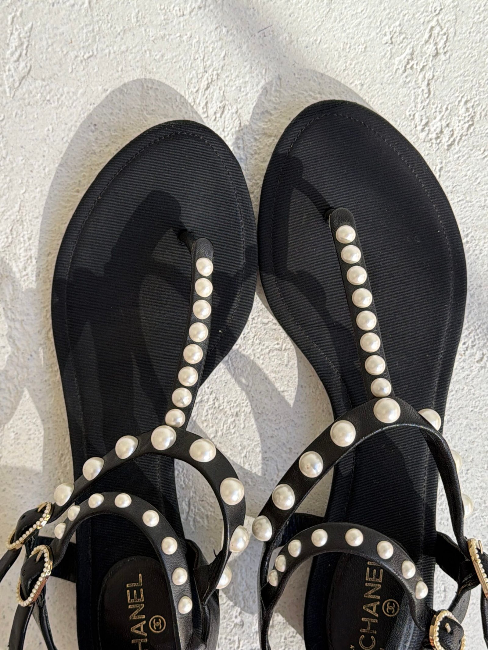Chanel Black Leather Faux-Pearl Embellished Double Strap Thong Sandals, Size 38.5, Black color