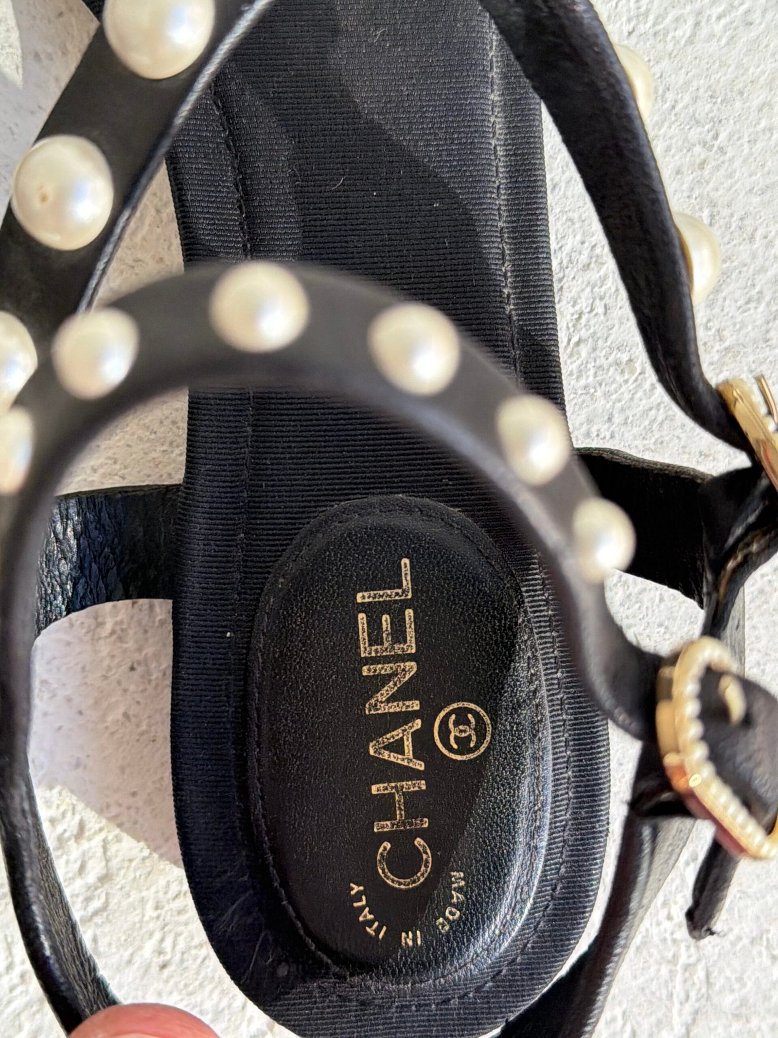 Chanel Siyah Deri Suni İnci Süslemeli Çift Askılı Tanga Sandalet