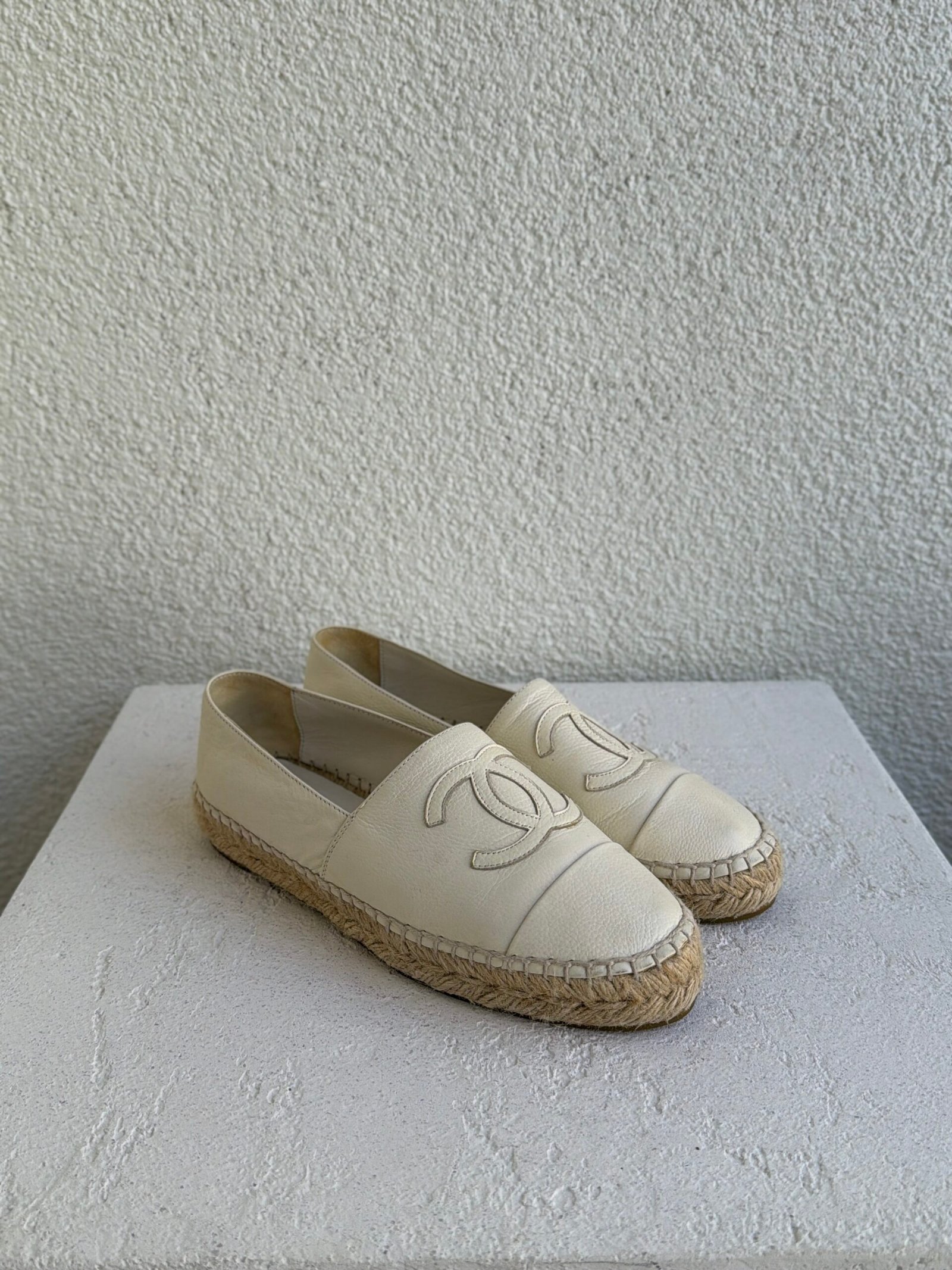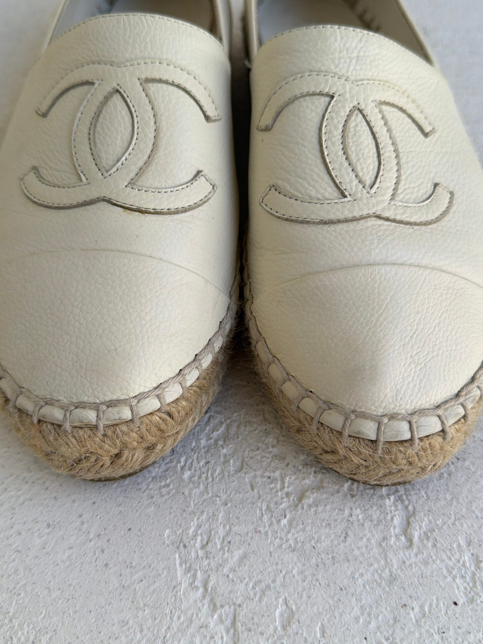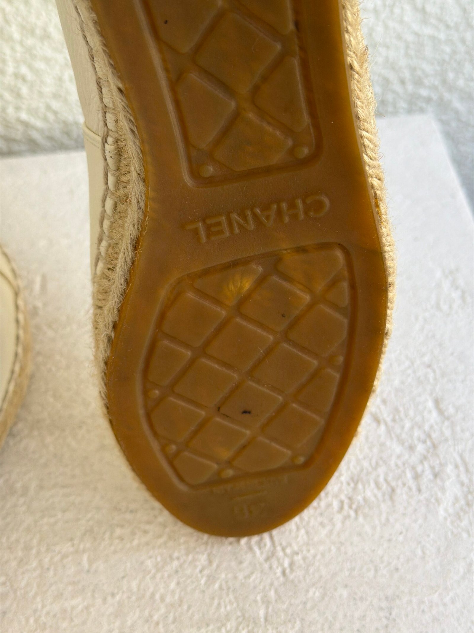Chanel CC Logo Leather Espadrilles, Size 36, Ecru color