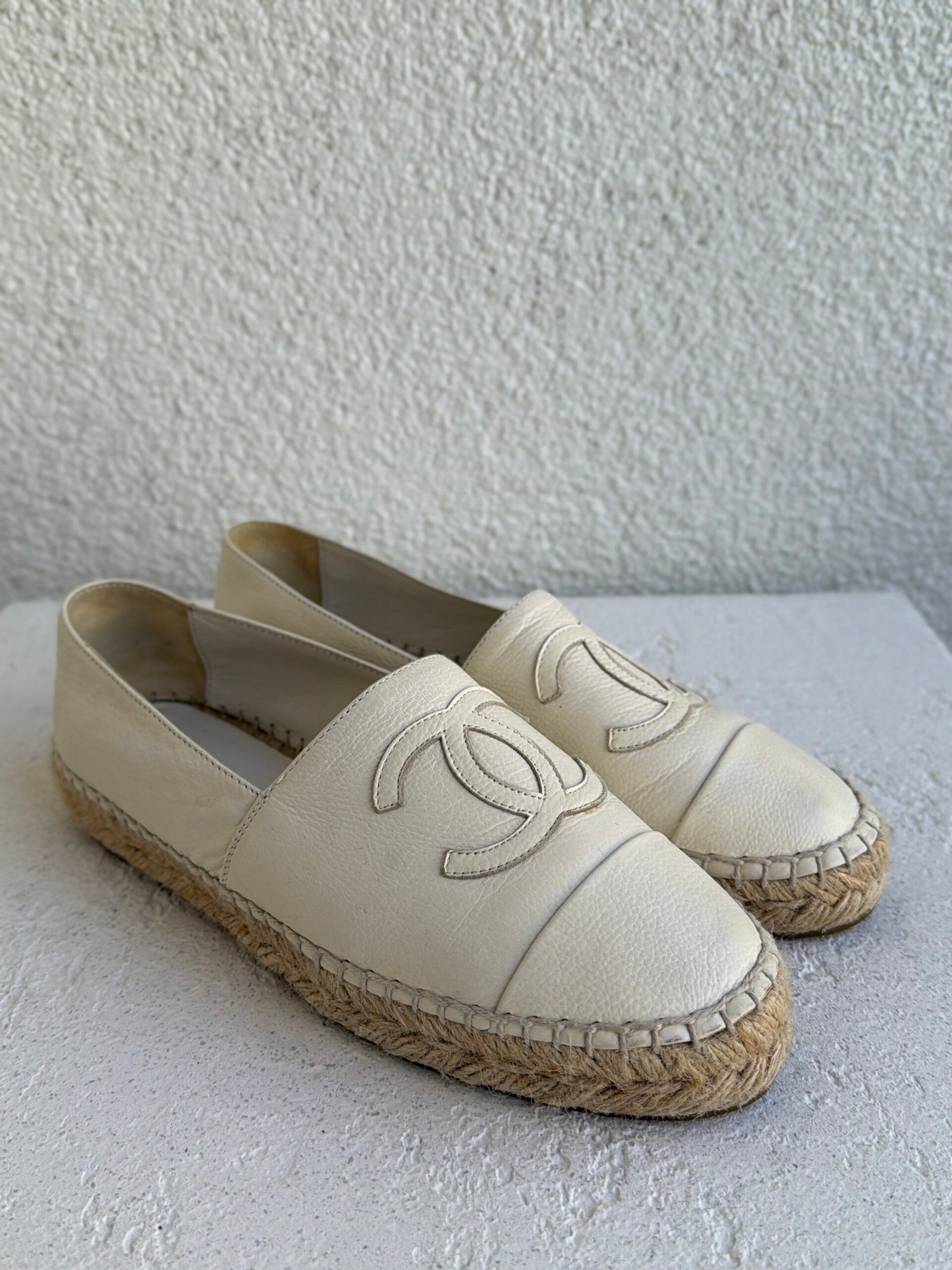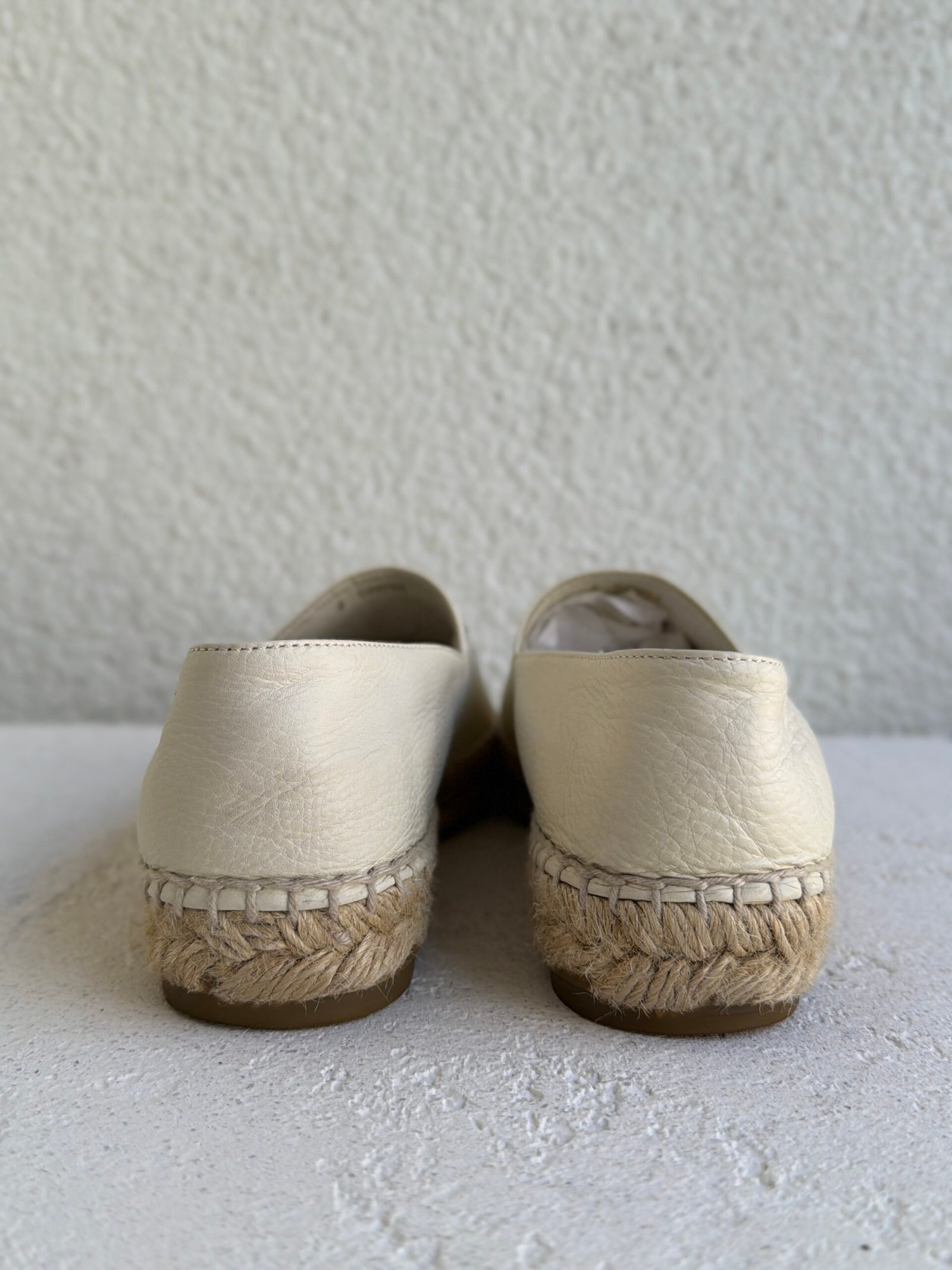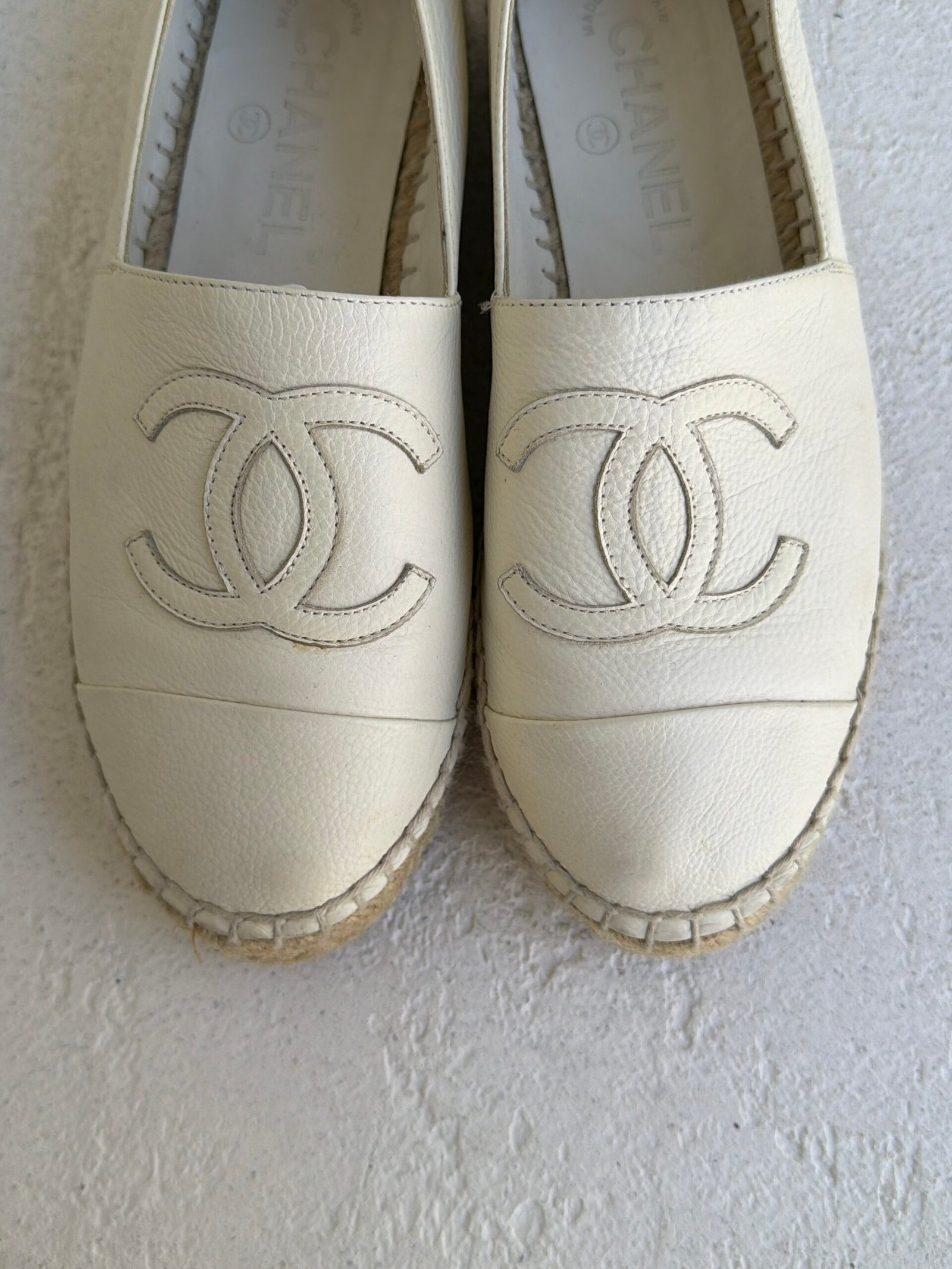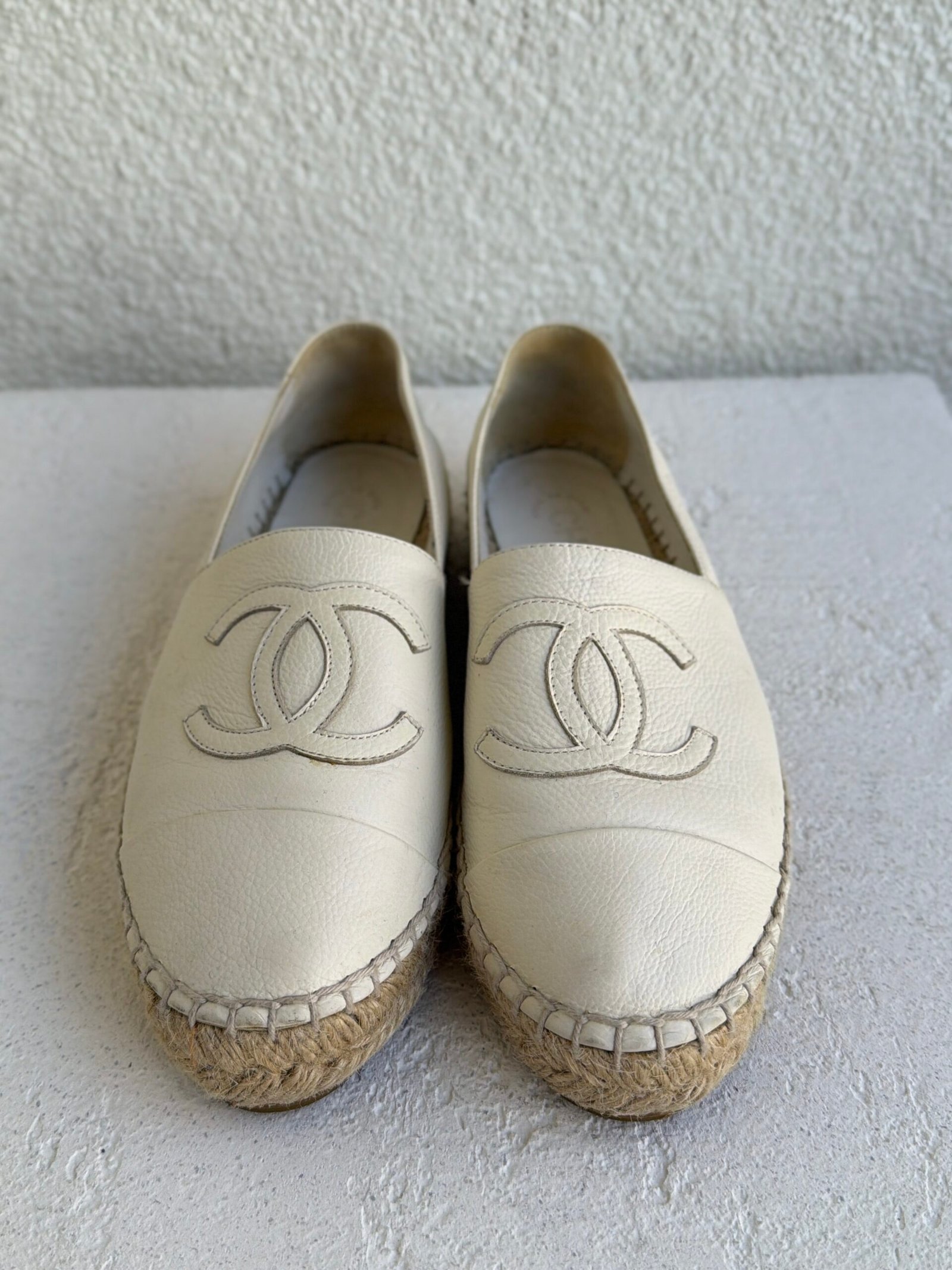 Chanel CC Logo Leather Espadrilles, Size 36, Ecru color