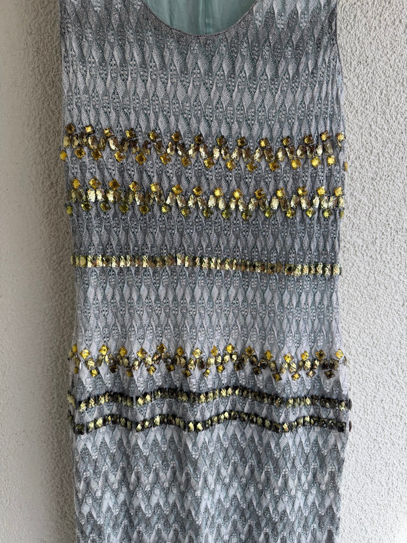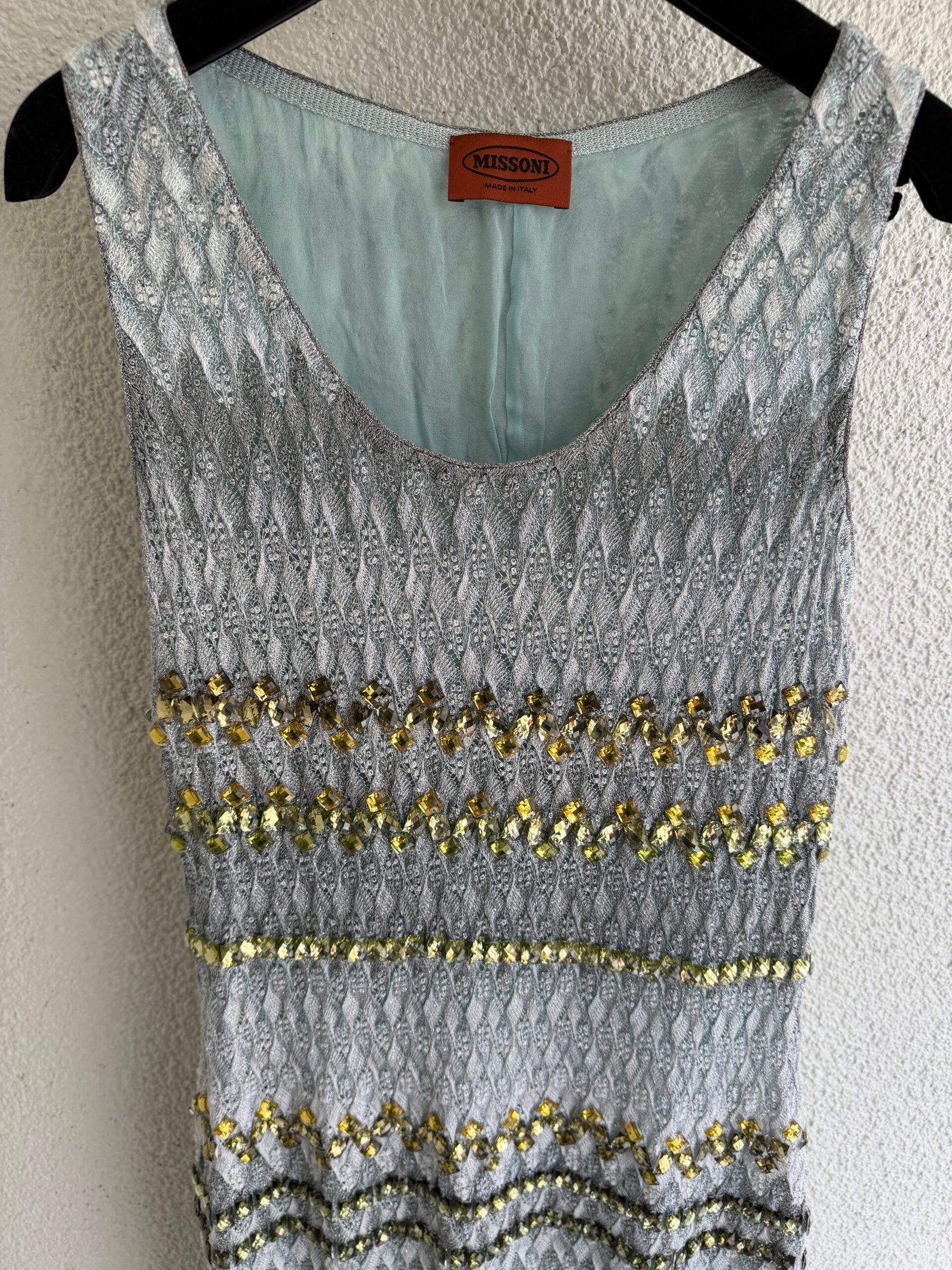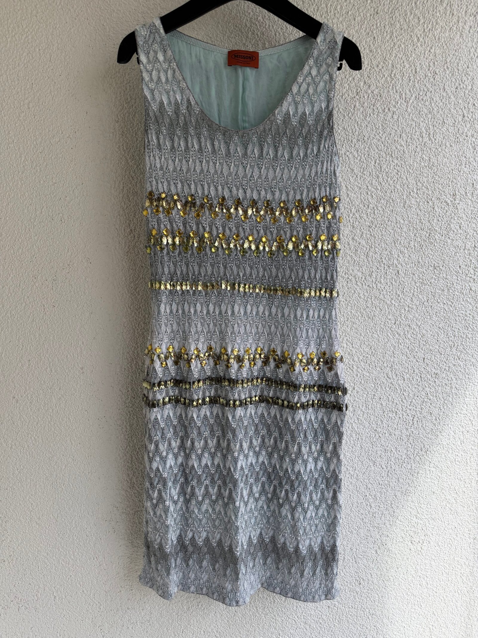 Missoni green sequined mini dress, size IT 40, chest width 42 cm, length 100 cm. 97% Silk, 3% Elastane.